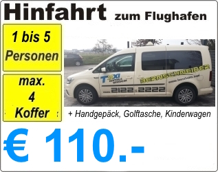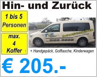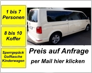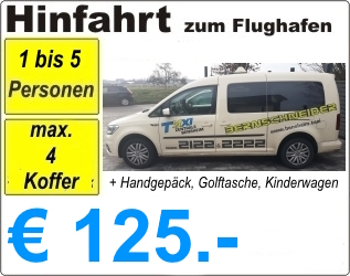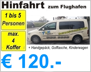 Bei Fahrten mit 5 oder 6 Personen können max. 4 Koffer zusätzlich in unseren VW Caddy Maxi befördert werden. Kleinere Koffer wie Trolleys, Reisetaschen etc. sind problemlos einzuladen.