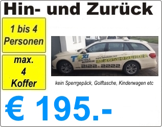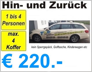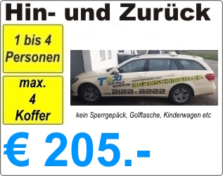 Bei einer Buchung für Hin- und Zurück sollte die Ankunftszeit bei der Abholung am Flughafen vor 21.00 Uhr liegen. Spätere Abholungen können nicht mehr ausgeführt werden !!